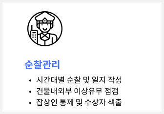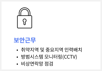 건물 내방객에 대한 친절한 안내와 절도 있는 동작을 유지하며, 입주민들의 안전활동보장과 도난사고예방을 함으로써 고객사의